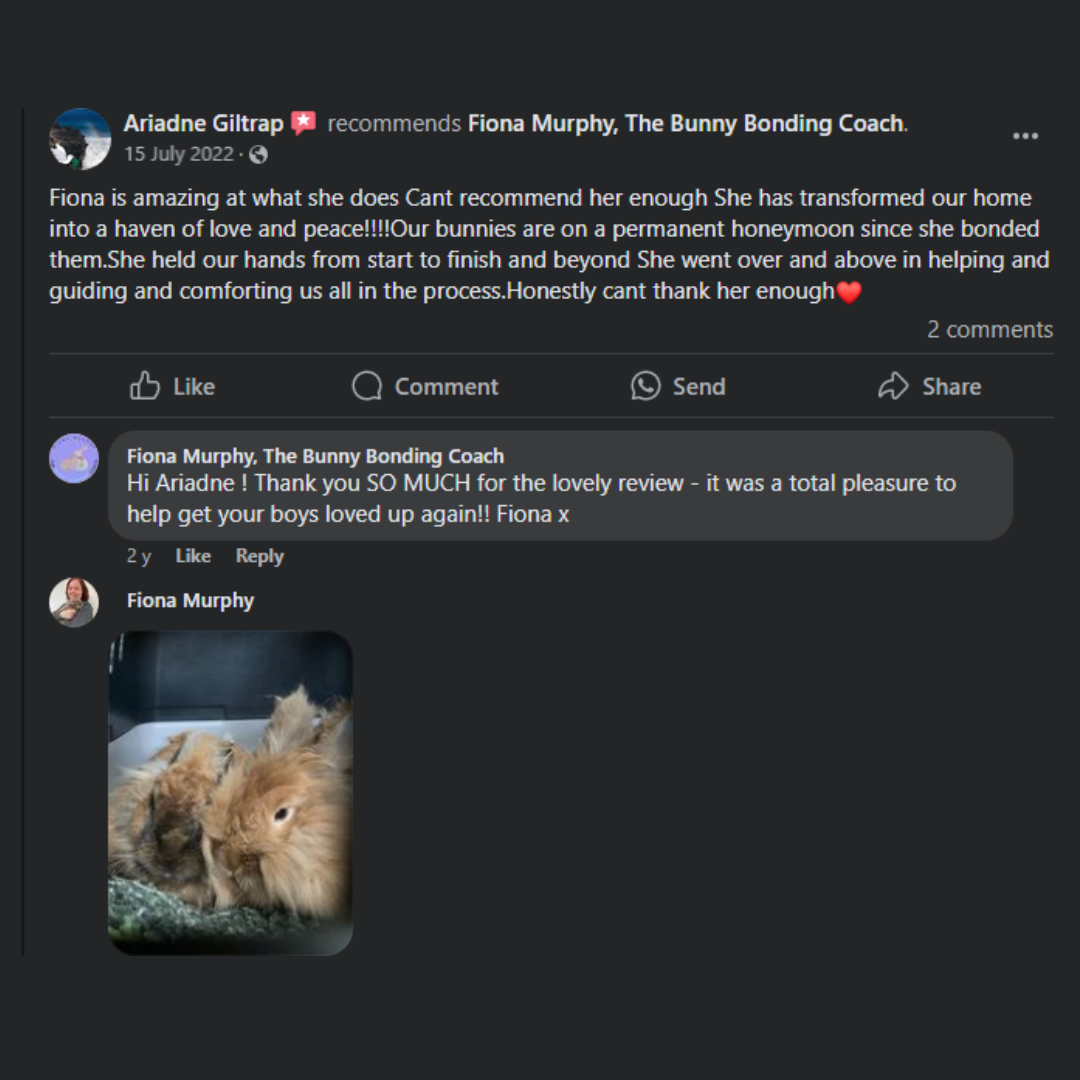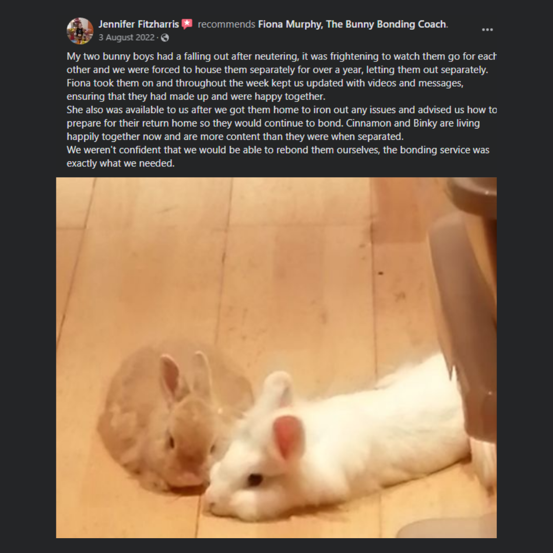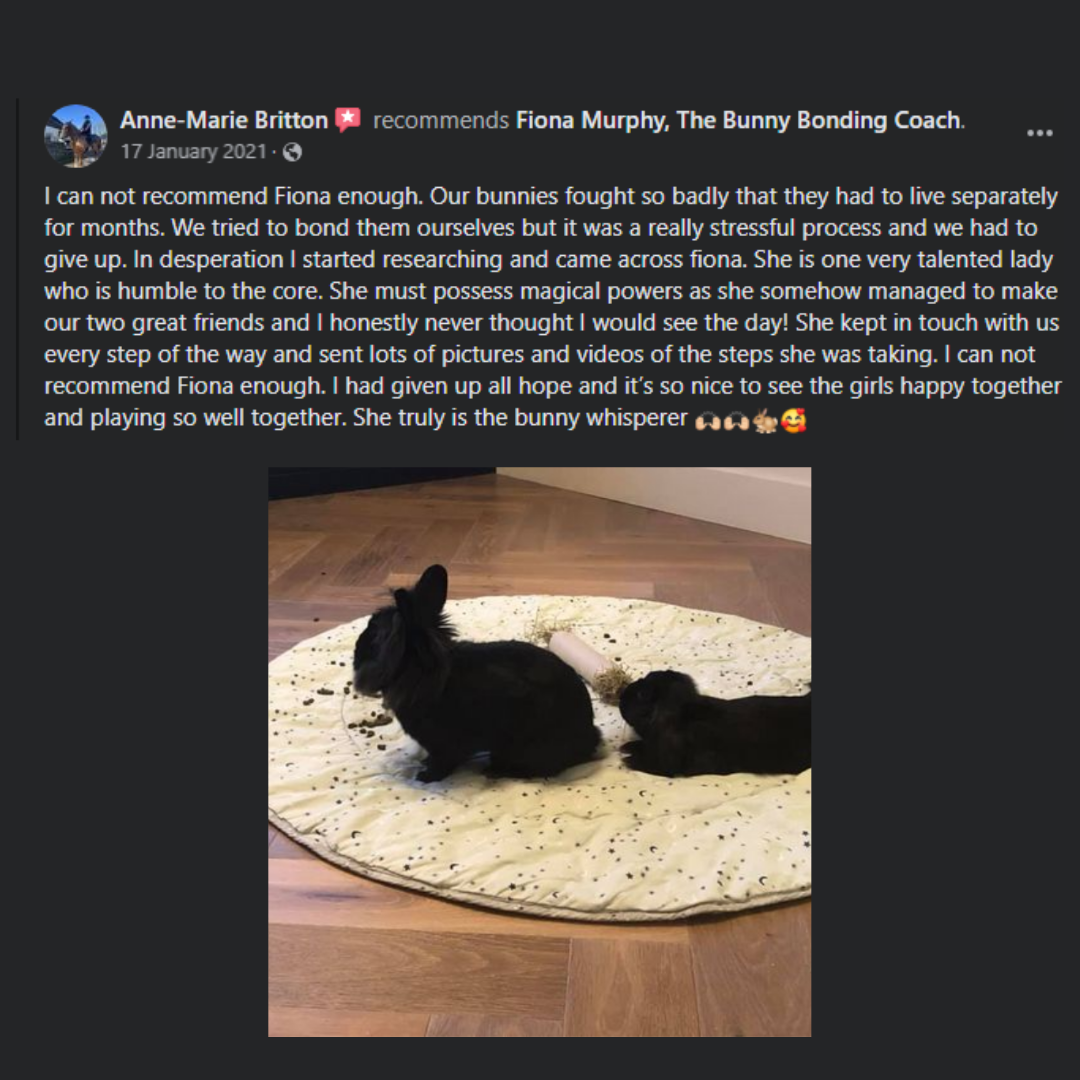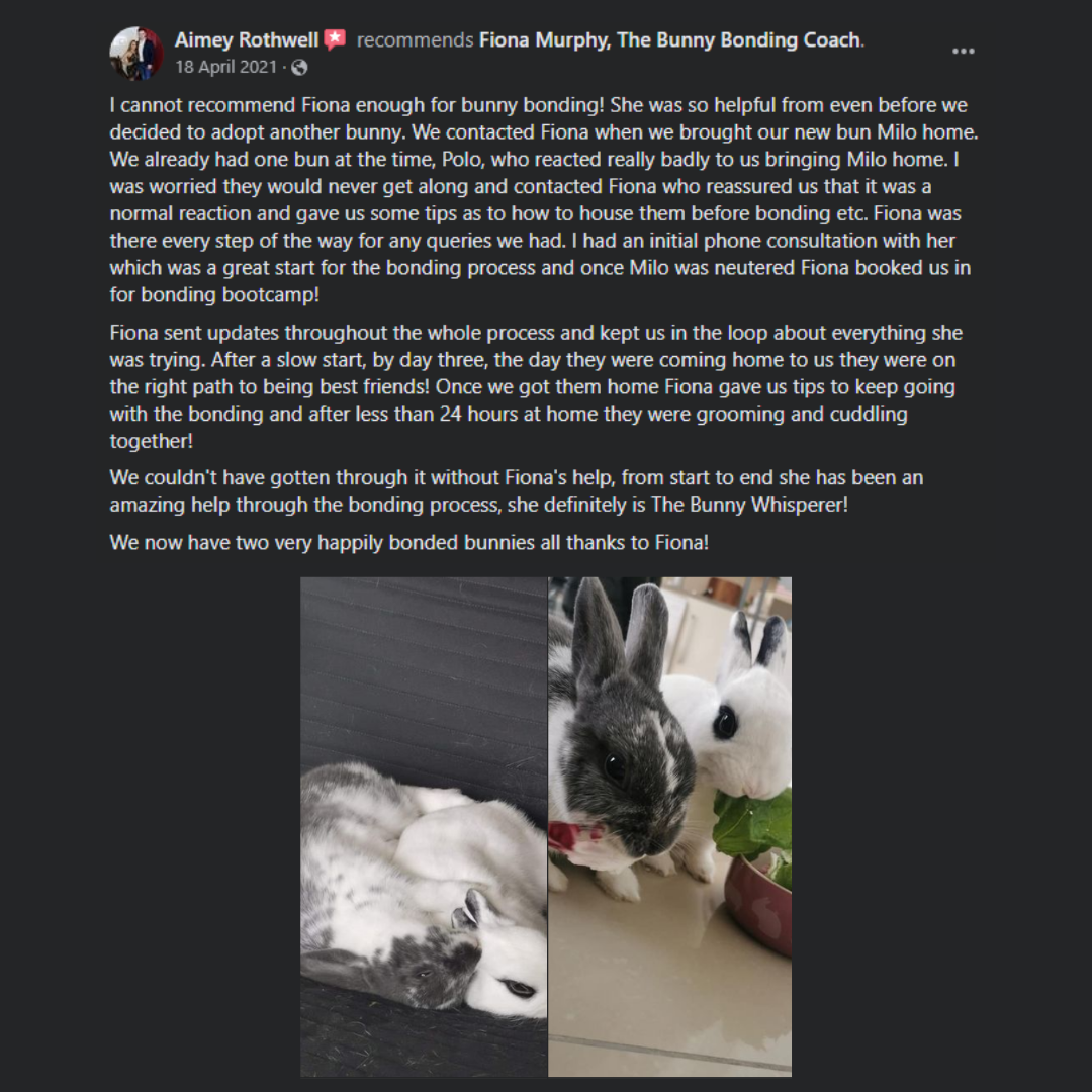 I have over 10 years of experience bonding rabbits and have bonded over 270 sets of bunnies - I have also helped hundreds of other bunny owners bond their bunnies at home themselves around the world, with my support!