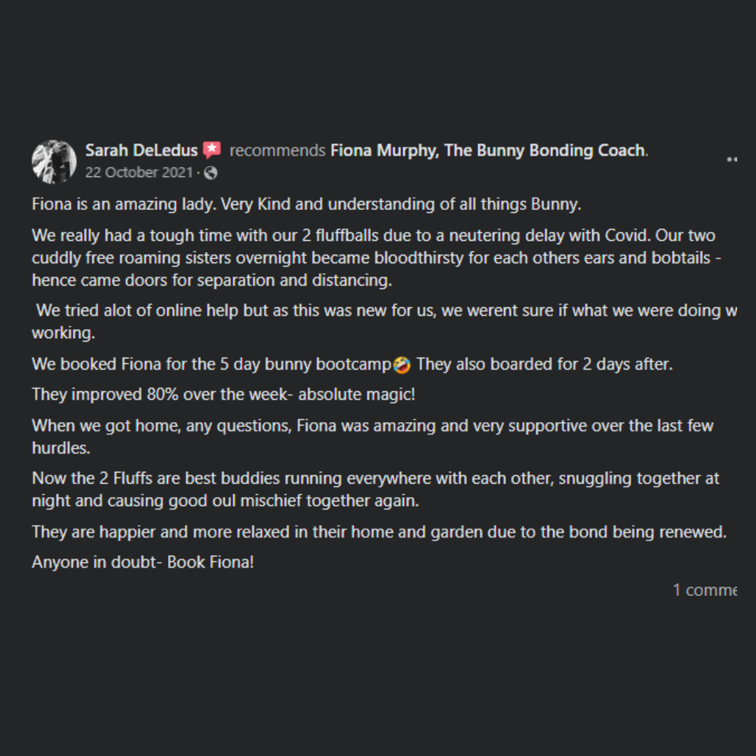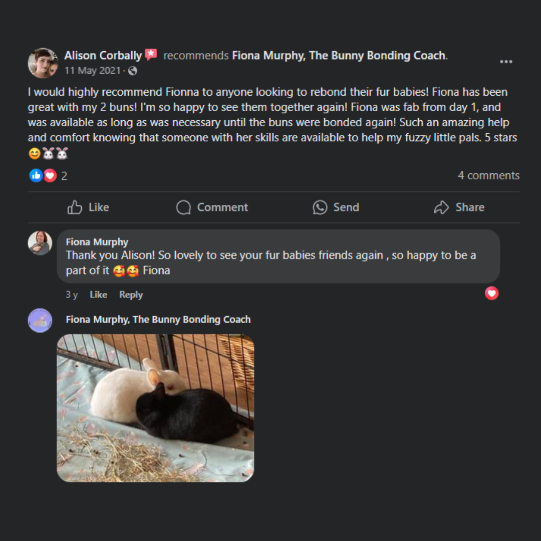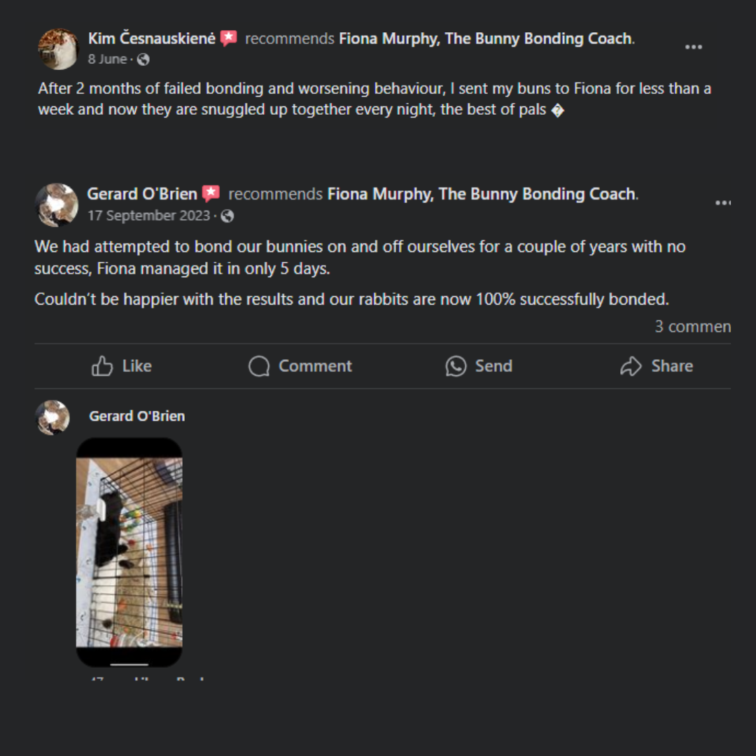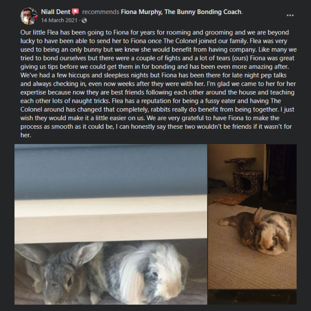I have over 10 years of experience bonding rabbits and have bonded over 270 sets of bunnies - I have also helped hundreds of other bunny owners bond their bunnies at home themselves around the world, with my support!