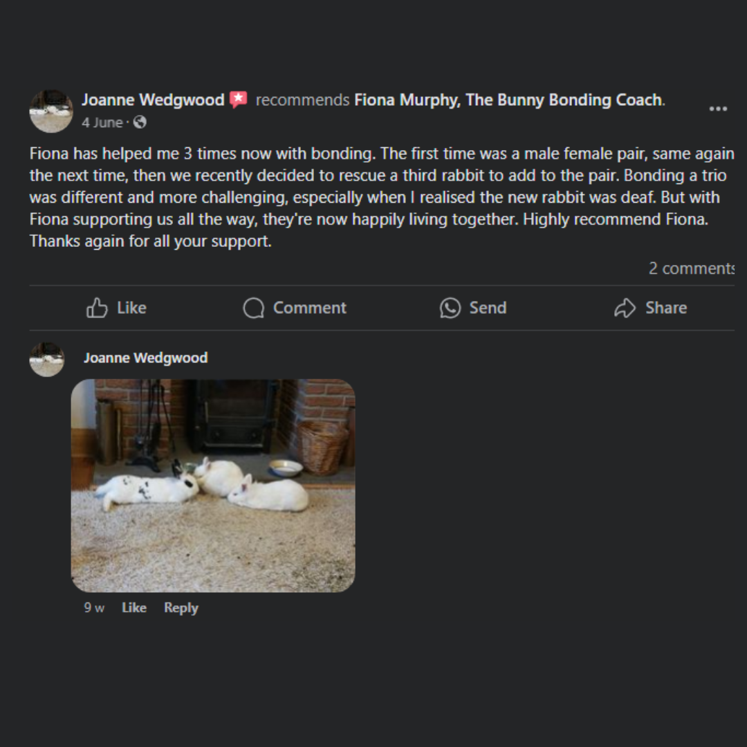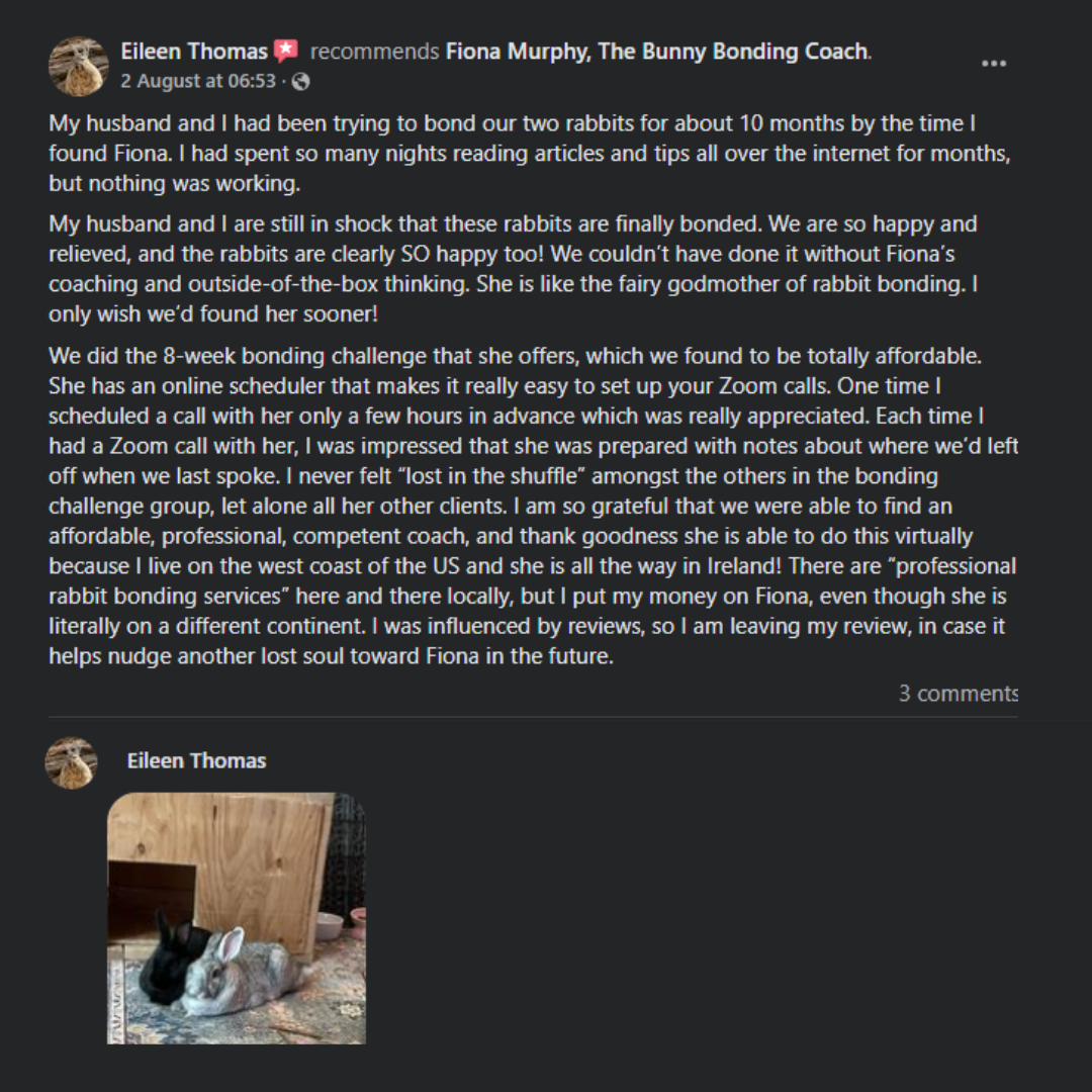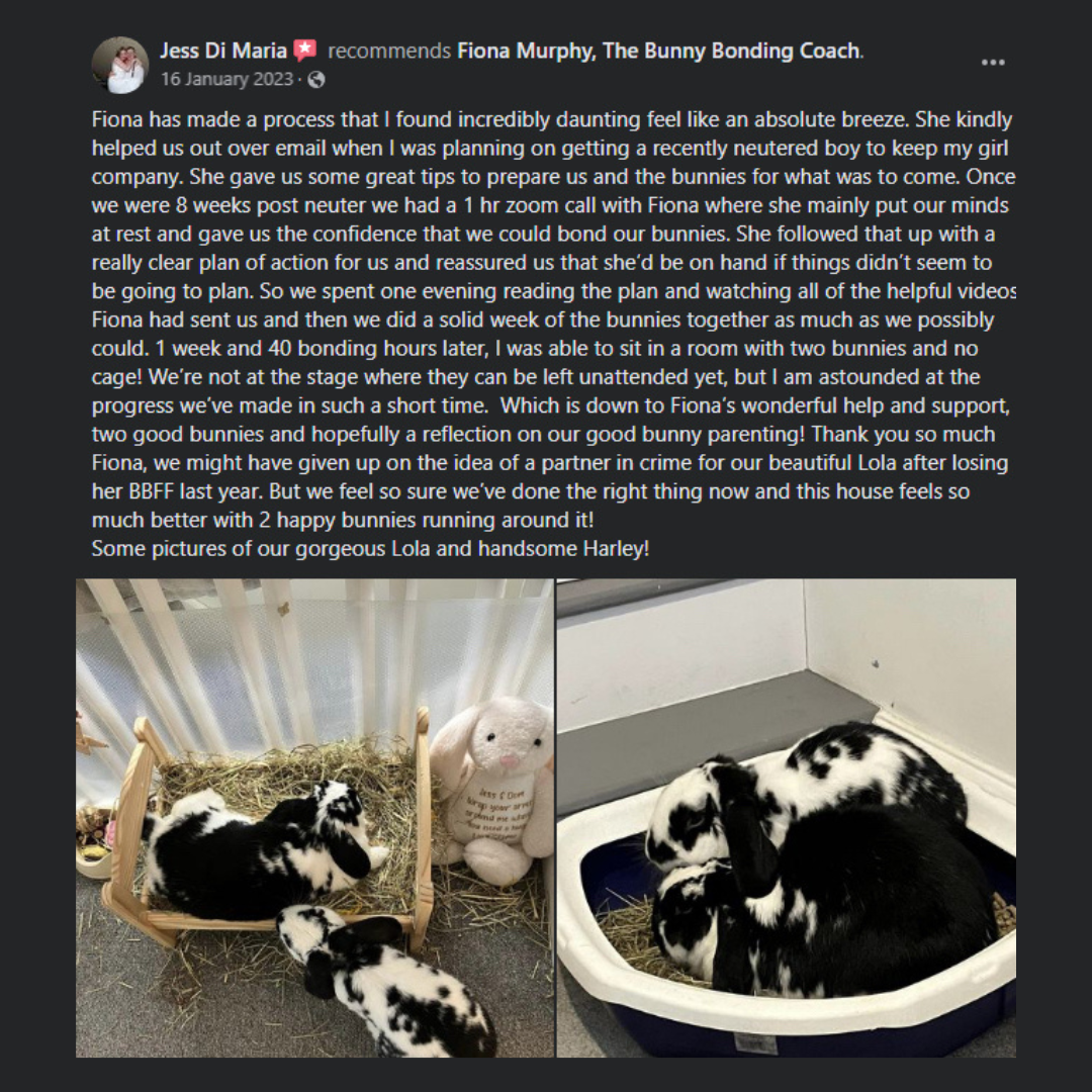 “After watching the classes, I realised where I had been going wrong, what was causing the fights and so much aggression from my pair to my third rabbit and cost me over €1500 in vet bills! One change made all the difference - the aggression stopped completely, and the grooming / cuddling started to happen after 3 days, and now all three of my rabbits are living together free roam and I just can't believe it! I can't thank you enough Fiona for your support and classes, as I feel like I have my life back again and my rabbits are all happy and binkying and zooming around together and a massive weight has been lifted!! I honestly can't thank you enough for the support! I never thought I would be able to do this myself after the last 6 months of chaos, tears and emergency visits! I am so, so appreciative - you've no idea!"