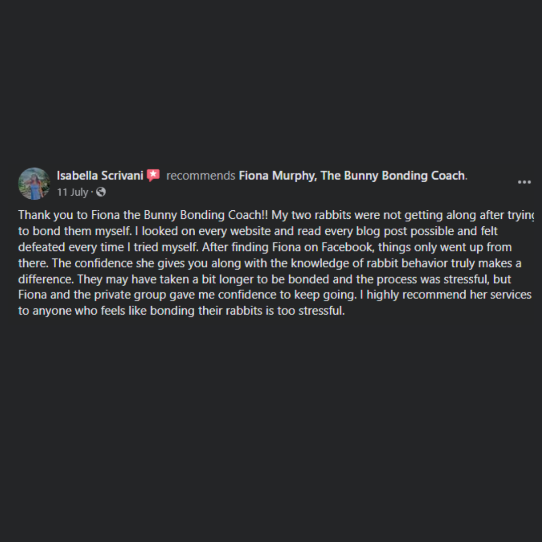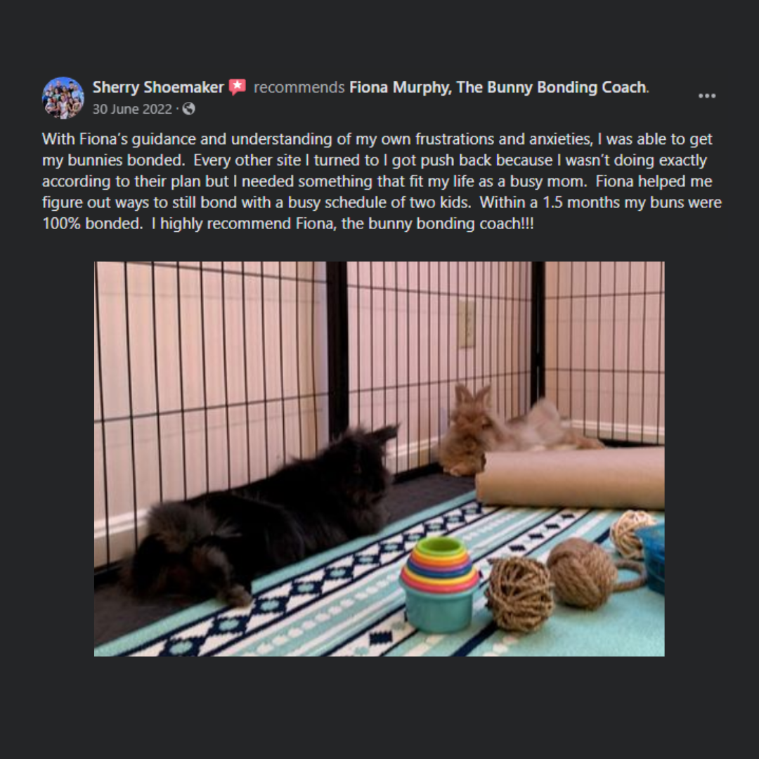 “With Fiona's guidance and understanding of my own frustrations and anxieties, I was able to get my bunnies bonded. Every other site I turned to I got push back because I wasn't doing exactly according to their plan, but I needed something to fit my life as a busy mom. Fiona helped me figure out ways to still bond with a busy schedule of two kids. Within 1.5 months my buns were 100% bonded. I can't thank Fiona enough for guiding me through this! I highly recommend Fiona, The Bunny Bonding Coach!!!”